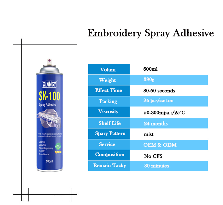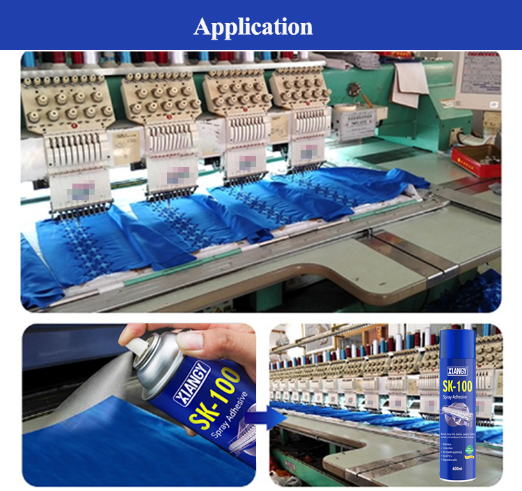 Application:Embroidery Spray Adhesive is widely used in computerized embroidery industry to paste leather, foam, children’s clothing, underwear, nylon and various light materials. At the same time, it has the characteristics of long operation time and maintains stickiness within 30 minutes. It is particularly important that this spray adhesive has passed the SGS non-toxic test and does not contain formaldehyde and chlorine solvents.